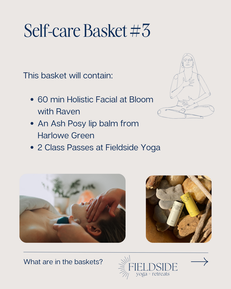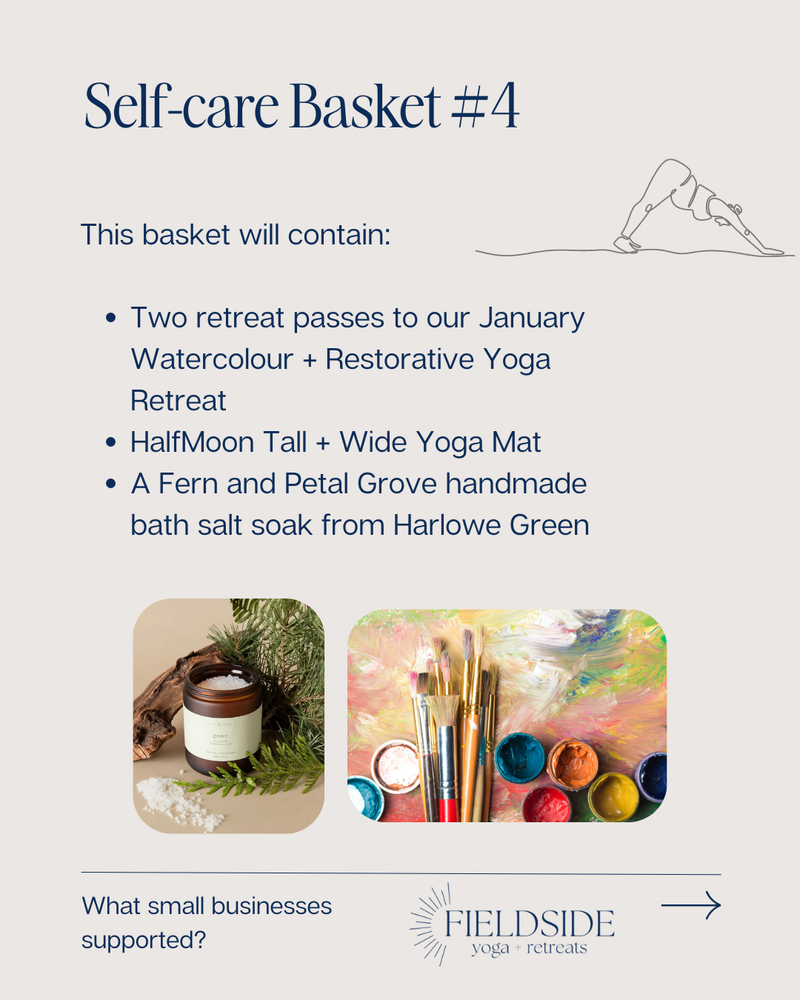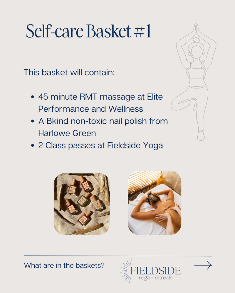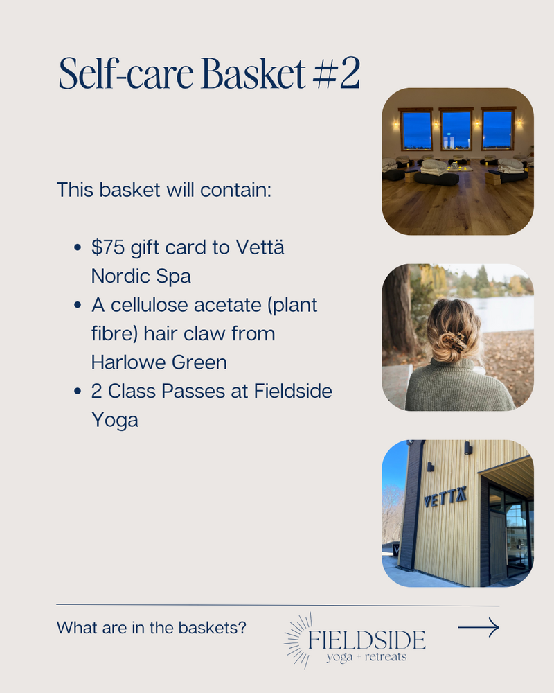 Each basket features curated items from local women-owned businesses, a Vetta Spa gift card, and Fieldside Yoga class passes and retreat offerings.